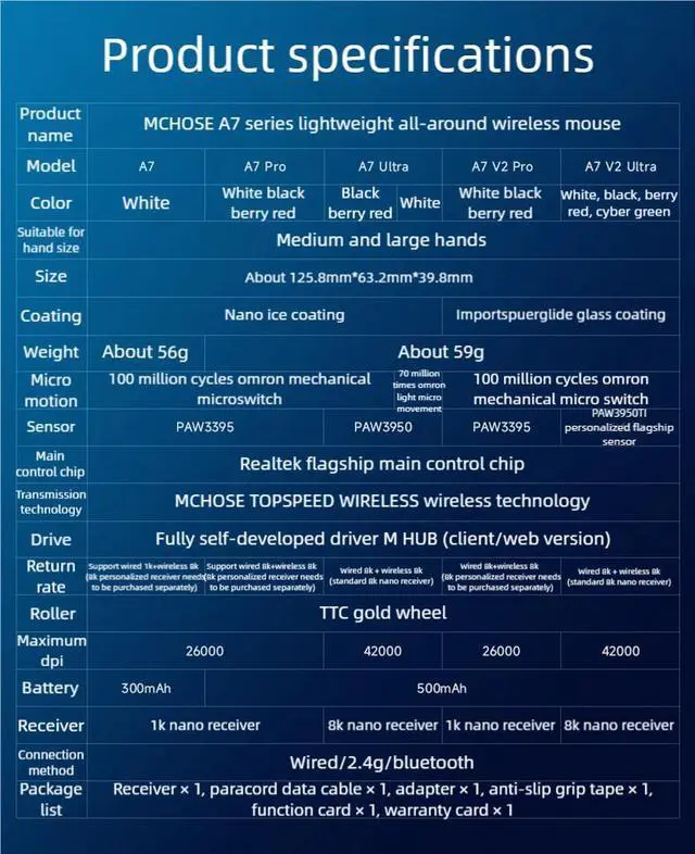 DUAL 8000KHz POLLING: With a polling rate of up to 8000Hz, the MCHOSE A7 mouse delivers flawless wireless performance with lightning-fast response times. (8K user receiver sold separately)