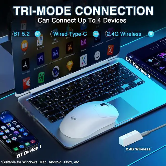 Tri-Mode Wireless Mouse: This gaming mouse supports connecting USB-C, 2.4GHz wireless, and 2*BT5.2 devices, Seamlessly switch between devices such as PCs, laptops, and tablets, allowing you to use it flexibly in various scenarios. It is also compatible with multiple systems such as Windows 7/8/10, Vista, XP, Mac, Windows 2000, and Linux