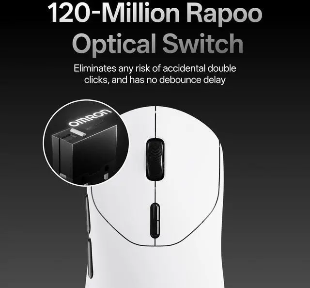 120-Million Optical SwitchRegistering mouse clicks using infrared light instead of mechanical contact, the optical switch eliminates any risk of accidental double clicks, and has no debounce delay but a longer 120-million lifespan. For users who prefer traditional mechanical clicking feedback, we recommend to choose the VT2 version (100-million mechanical switch).