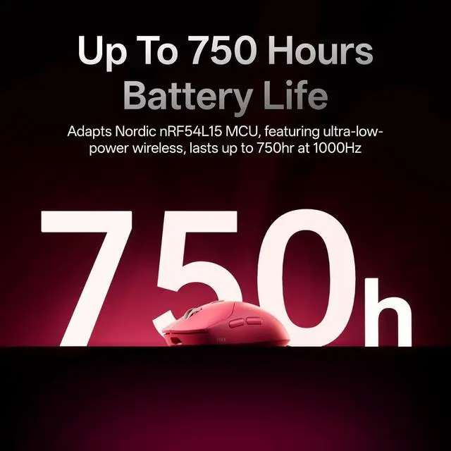 • Up to 750 Hours Battery LifeUpgraded with Nordic nRF54L15 MCU that integrates an ultra-low-power wireless technology, VT2 MAX manages to make wireless gaming mouse no longer dependent on frequent charging - with an unbeatable 750 hours battery life at 1000Hz.