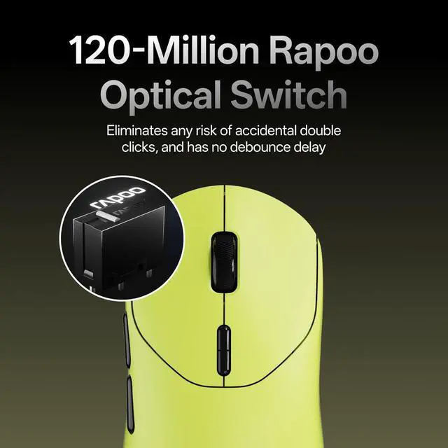 120-Million Optical SwitchRegistering mouse clicks using infrared light instead of mechanical contact, the optical switch eliminates any risk of accidental double clicks, and has no debounce delay but a longer 120-million lifespan. For users who prefer traditional mechanical clicking feedback, we recommend to choose the VT2 version (100-million mechanical switch).