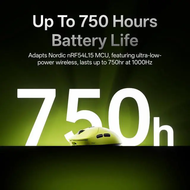 Up to 750 Hours Battery LifeUpgraded with Nordic nRF54L15 MCU that integrates an ultra-low-power wireless technology, VT2 MAX manages to make wireless gaming mouse no longer dependent on frequent charging - with an unbeatable 750 hours battery life at 1000Hz.