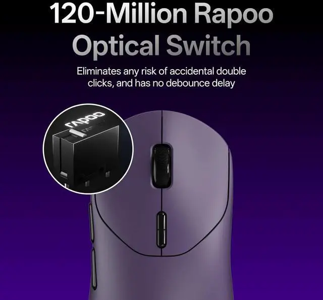 • 120-Million Optical SwitchRegistering mouse clicks using infrared light instead of mechanical contact, the optical switch eliminates any risk of accidental double clicks, and has no debounce delay but a longer 120-million lifespan. For users who prefer traditional mechanical clicking feedback, we recommend to choose the VT2 version (100-million mechanical switch).
