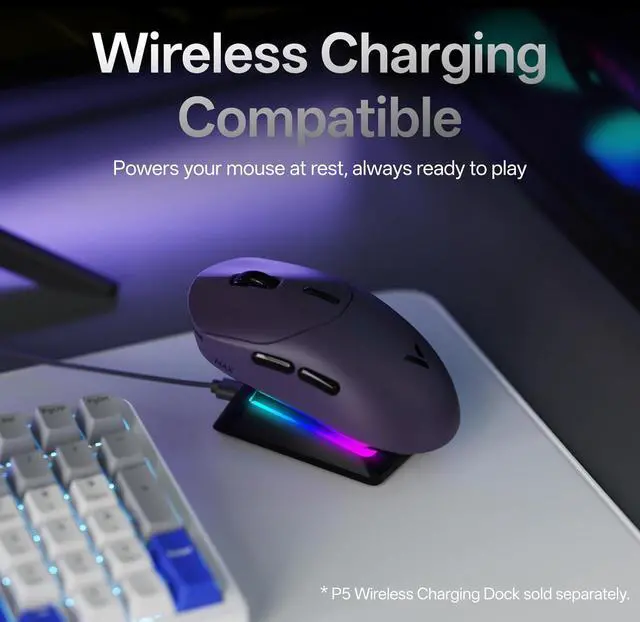 4. 120-Million Optical SwitchRegistering mouse clicks using infrared light instead of mechanical contact, the optical switch eliminates any risk of accidental double clicks, and has no debounce delay but a longer 120-million lifespan. For users who prefer traditional mechanical clicking feedback, we recommend to choose the VT2 version (100-million mechanical switch).