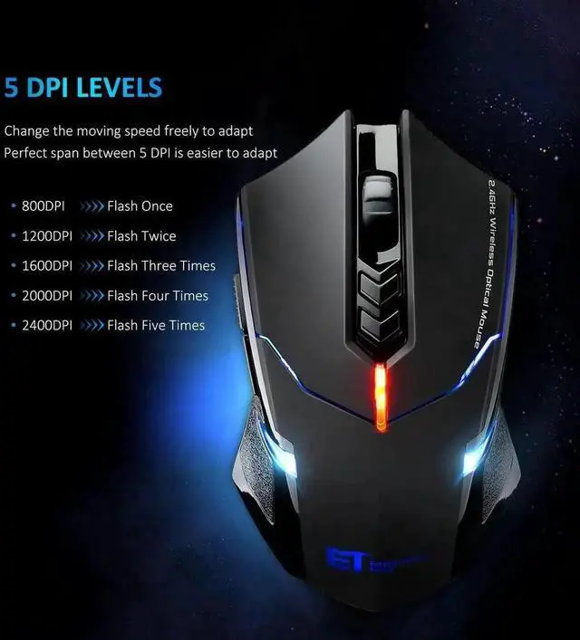 5 DPI Levels (2400, 2000, 1600, 1200, 800) to change the moving speed freely and can perfectly meet the needs both in gaming and office.