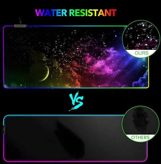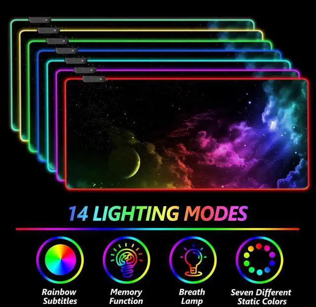 14 Lighting Modes. This Large mouse pad features 14 lighting modes: including colorful, dynamic breathing lighting mode, 7 static monochrome lighting mode and lights off mode. Providing stunning visual effects and creating an immersive game environment. Power-off memory function remembers the last lighting mode you selected