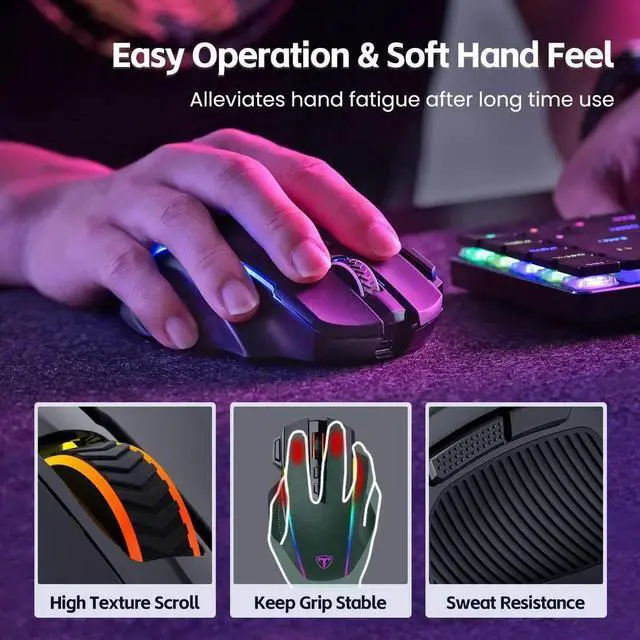 [Extreme Ergonomics & Professional After-Sales Service]This bluetooth gaming mouse is designed for medium-large hands, and if you have larger hands, you'll be amazed at how well-supported this gamer mouse is. Ring finger, pinky and thumb rest provide you with maximum comfort, matte texture is sweat-proof and non-slip, the first choice for computer gamers.