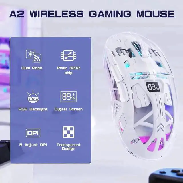 Unlike wired mice, the A2 wireless gaming mouse adopts advanced 2.4G wireless and BT 5.0 connection, plug and play, providing stable and low latency wireless connection for gaming, let you say goodbye to the cumbersome data line.