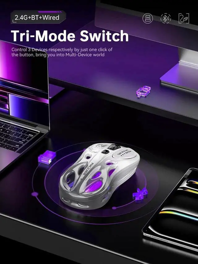 True Tri-Mode & 3-Device Switch Effortlessly connect via 2.4G USB receiver, dual Bluetooth, or wired Type-C. Seamlessly switch between 3 devices (Mac/Laptop/iPad/Android) for smooth gaming, office work, or daily use.