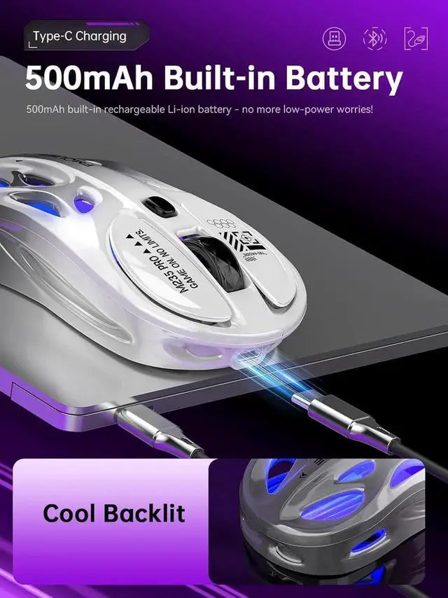 Ergonomic Comfort & Long-Lasting Battery Its unique hollow design (4.7x2.4x1.3 inches) reduces hand fatigue during extended use. The 500mAh rechargeable battery, paired with Type-C charging, delivers robust battery life, eliminating the need for frequent recharging.
