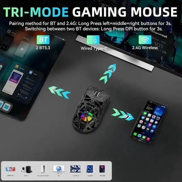 Triple Mode Connection: Seamlessly switch between 2.4GHz wireless, BT5.3, and wired USB modesthis gaming mouse can store up to 4 devices for quick switching between gaming and office scenarios. As a wireless gaming mouse, it offers broad compatibility with Windows, Mac OS, Linux, and Android systems, suitable for desktops, laptops, Macs, and more