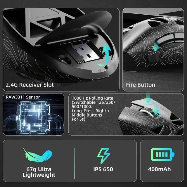 Adjustable 12,000 DPI: Thewireless mouse features 6 adjustable DPI levels-800, 1600, 3200, 4800, 8000, and 12000--perfectly suited for FPS sniping or spreadsheet operations. Paired with a 1000Hz polling rate, it delivers low latency and high fluidity.
