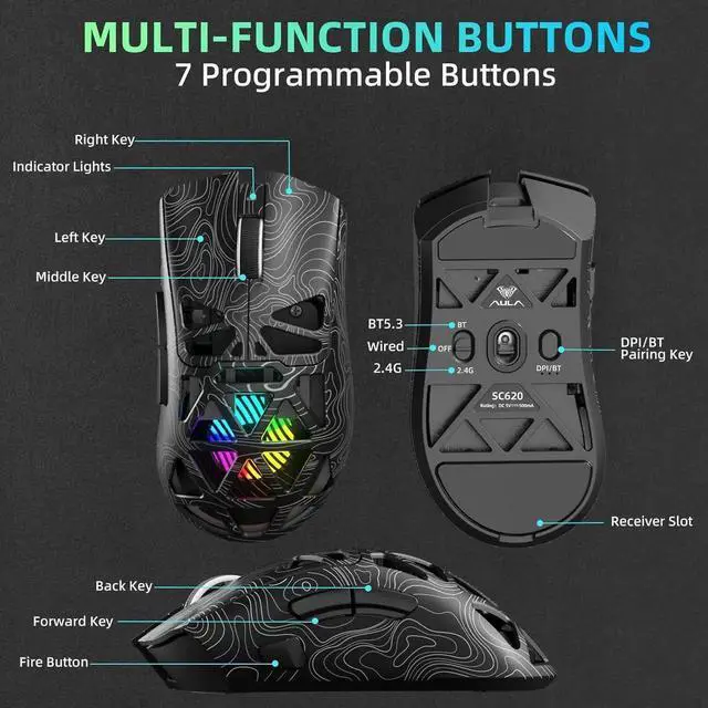 Macro Programming & Fire Button: This gaming mouse features 7 programmable buttons, supporting remapping, macro recording, DPI adjustment, polling rate, sleep time, and lighting mode settings via the AU-LA driver (soaidriver.com). Dedicated Fire Button for One-Click Critical Commands: Map game burst fire, MMO skill combos, or office app shortcuts-eliminating repetitive clicks and complex keybinds. Whether eliminating enemies or optimizing workflows, it transforms complex actions into single-click execution, elevating your wireless mouse gaming experience. Note: Supports Windows systems in 2.4GHz wireless and wired modes; BT mode is unavailable