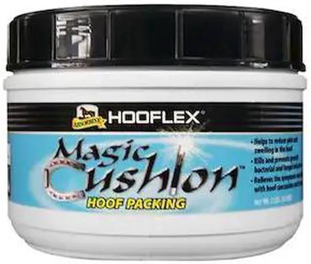 A unique medicated hoof packing, this anti-inflammatory and analgesic hoof packing is used for the reduction on concussion, pain and trauma within the hoof capsule of the equine athlete. This scientifically proven hoof packing can be used daily after workouts or under a protective pad to reduce pain and inflammation within the anatomical structures of the hoof. The reduction in pain and inflammation will then promote hoof growth. Magic Cushion is the only anti-inflammatory and analgesic hoof packing on the market and is a treatment type hoof packing and provides a reduction in pain and trauma within the hoof of the equine athlete.