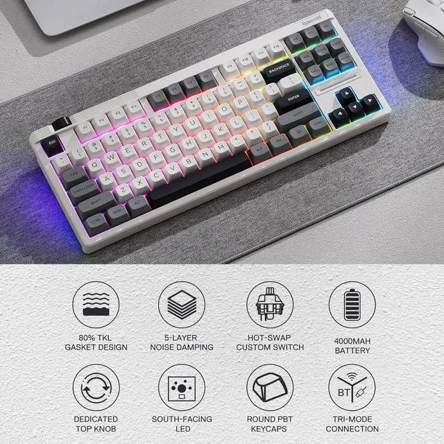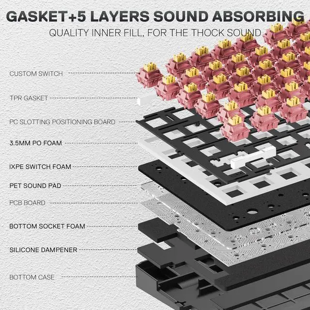 Noise Dampening x 5 - Equipped with 3.5mm PO foam, IXPE switch foam, PET sound pad, bottom socket foam, silicone bottom pad along with the silicone gasket. Significantly reduce the hollow noise, creating dampened and ultra-clean typing acoustics, making each keystroke satisfying and comfortable