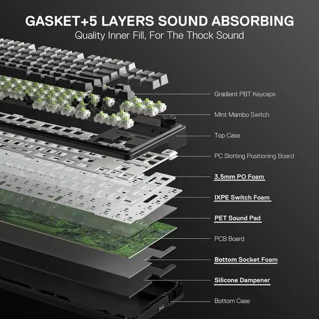 Noise Dampening x 5 - Equipped with 3.5mm PO foam, IXPE switch foam, PET sound pad, bottom socket foam, silicone bottom pad along with the silicone gasket. Significantly reduce the hollow noise, creating dampened and ultra-clean typing acoustics, making each keystroke satisfying and comfortable