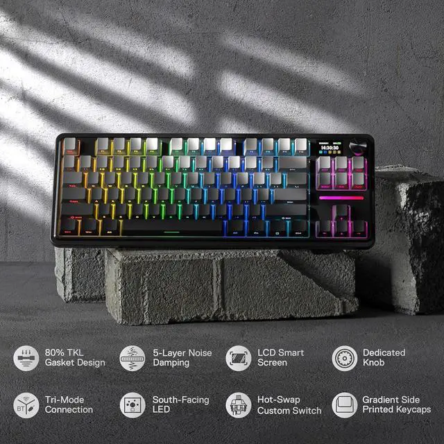 80% TKL Form Fact - K743 PRO tenkeyless features an 84 keys layout design, cutting loose the numpad for more mouse-moving space. Misery vibe gradient PBT keycaps with side-printed tech equipped with south-facing LEDs, the RGB glows never looked so good