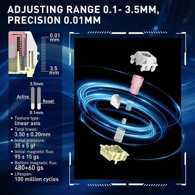 Rapid Trigger Tech - Combine the Hall magnetic switch with rapid trigger ON via software, the actuation point can be 0.1mm precision adjusted between 0.1-3.4 mm (The actual effect of the 0.1-0.2 mm actuation point may be affected by the normal tolerances of the components), ultra-precise actuation point combo with dynamic activation/deactivation defines your one-tap-kill.
