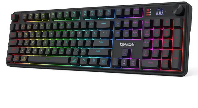 Redragon K526 PRO RGB Wireless Membrane Gaming Keyboard, 104 Keys Mechanical-Feel Keyboard w/ LED Info Display, Media/Backlit Knob Control, Smooth Linear Switch & Software Supported