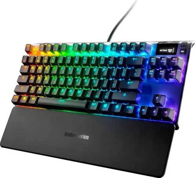 Deliver winning strokes with this SteelSeries Apex Pro TKL mechanical gaming keyboard. The compact size helps save space on your desktop, while onboard memory stores frequently used macros and RGB lighting settings. This SteelSeries Apex Pro TKL mechanical gaming keyboard features a detachable wrist rest and adjustable switches for added comfort during marathon sessions.
