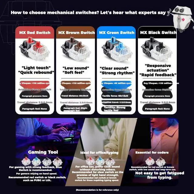 Switch Durability: Equipped with original German CHERRY MX switches (Red/Tea/Blue/Black options) | 50 million keystroke lifespan | 1.42.0mm actuation travel | 4560g actuation force for balanced tactile feedback and long-term stability.