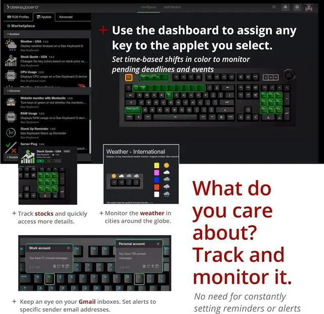 This updated Das Keyboard 5QS Mark II features the new gold standard in mechanical switches, Cherry MX2A. With ring lubrication on the socket dome, typing is smoother and more comfortable. Your fingers will thank you. Boost productivity by displaying information (e. g., weather, stock quotes, project progress, CPU usage, etc. ) in color on the keys with Q software.