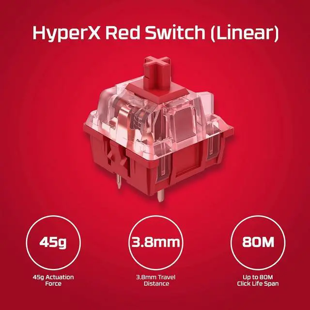 HyperX Mechanical Fire Switches (Linear): Responsive and durable switches with a smooth keystroke experience, optimized for gaming performance and rated for 80 million clicks.