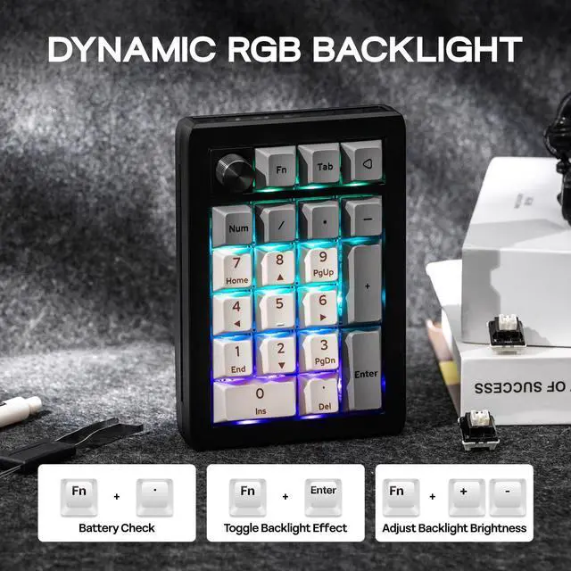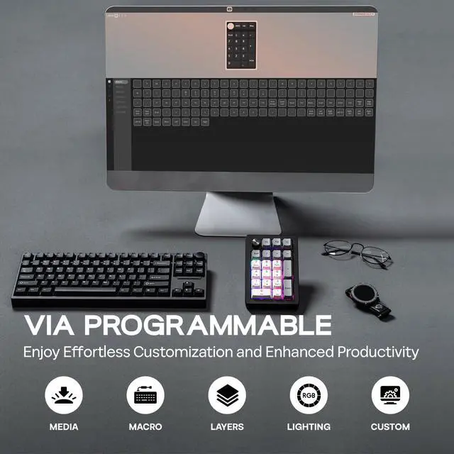 Enjoy effortless volume control and personalized functionality with the EK21's elegant aluminum alloy knob. Customize its actions via VIA software to match your workflow. Crafted for quality, the knob provides smooth, precise adjustments and adds a sophisticated touch to your numpad, elevating your overall experience.