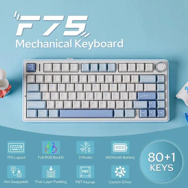The F75 boasts a five-layer sound and shock-absorbing internal design, including two layers of Poron foam, an IXPE switch pad, a PET sound enhancement pad, and a bottom silicone pad. This sophisticated construction reduces typing noise and resonance, delivering a tranquil and focused typing environment.