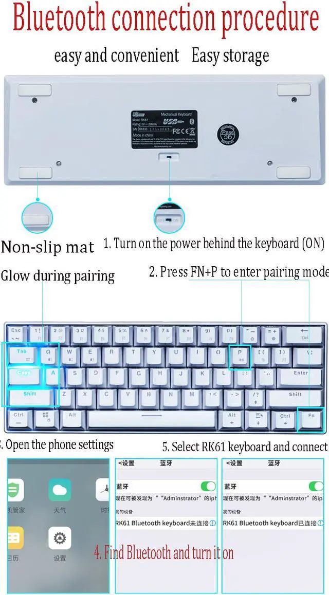 4.Built-in rechargeable battery: Users get pleasure from up to 10 hours of writing time with only one charge. RK61 bluetooth keyboard has a rechargeable lithium-ion battery. Standby time is up to 360 hours. If it is power off, you can change into USB mode.