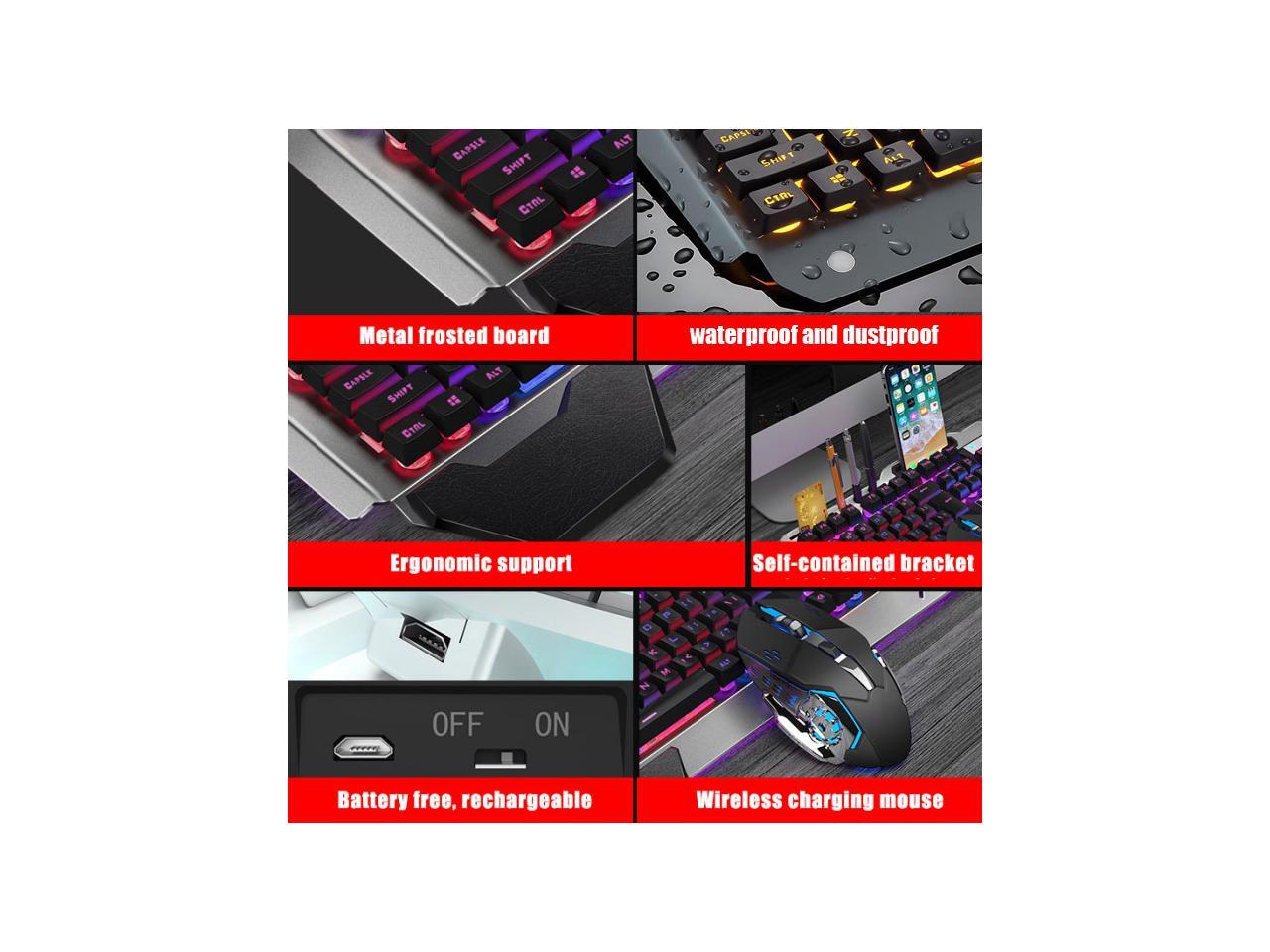 Wireless Gaming Keyboard Mouse and Bluetooth Headset Kit, Rainbow Backlit Rechargeable Ergonomic Metal Mechanical Feel Keyboard with Removable Palm Rest for Laptop PC Gamer