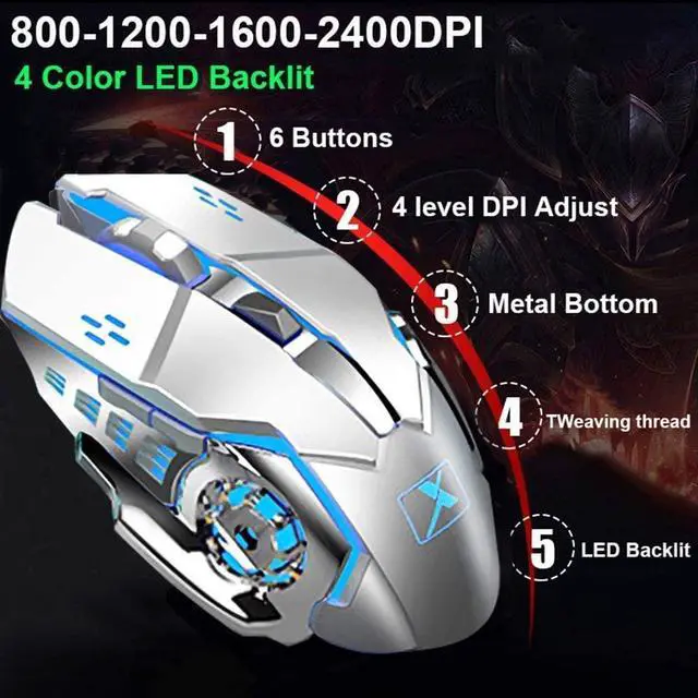 Mute Mouse with Adjustable DPIThis wireless gaming mouse has a cool engine shape appearance with 6 button, 7 color breathing LED backlight, 4 level DPI(800-1200-1600-2400), and smooth mouse feet mat, silent click, flexible gliding, adjustable DPI, breathing backlight.