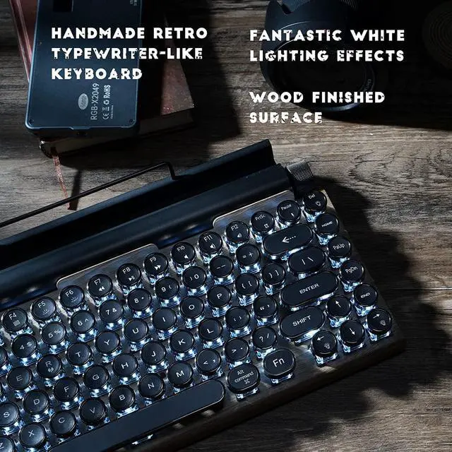 Retro Typewriter Style Design: The wood finished surface, retro round keys and typewriter-like looks provide good balance between functional keyboard and vintage decoration. Best decors and functional keyboard for your office or home setups.