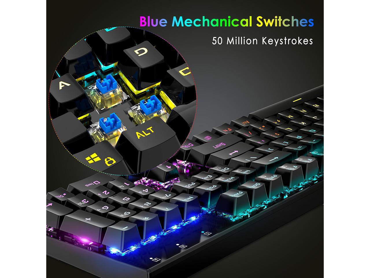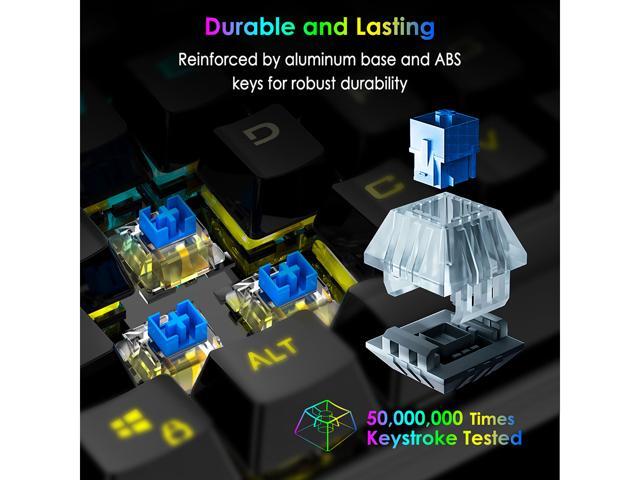- Durable and comfortable dual experience: the blue mechanical switch activates every key, and provides a superior typing experience than the rubber dome keyboard, more than 50 million keystroks experience,Meticulously crafted from Solid Aircraft-grade Aluminium and ABS materials.Bicolor mold keycaps which can avoid sweat on the keycaps, durable.