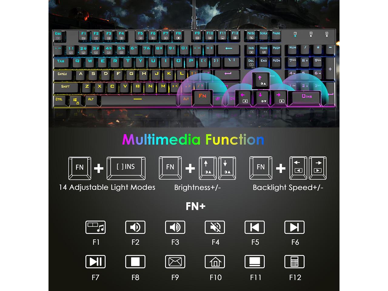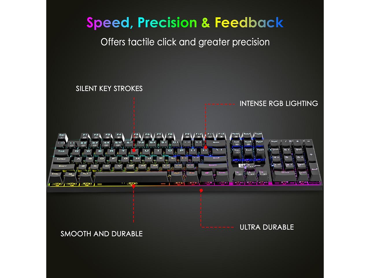 - 104 Keys Mechanical Keyboard :A backlit, full-sized mechanical keyboard with 104 keys no rush provides smooth and lightweight linear action.