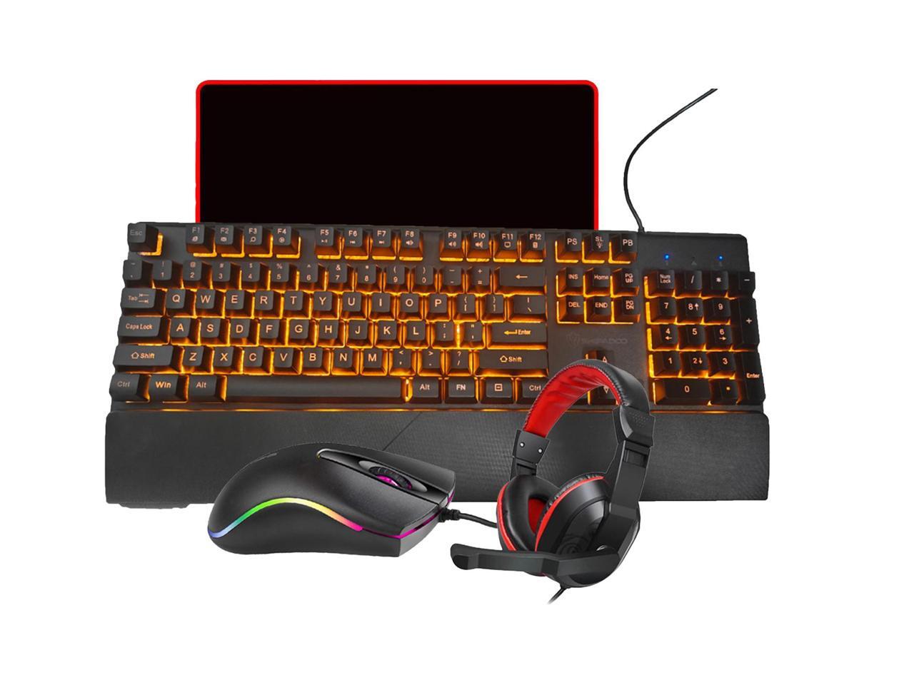 - [Gaming keyboard, mouse and headset mouse pad set] The set includes a LED backlit gaming keyboard, 7200 DPI Mouse, Gaming headset, Mouse Pad. USB connection, plug and play.