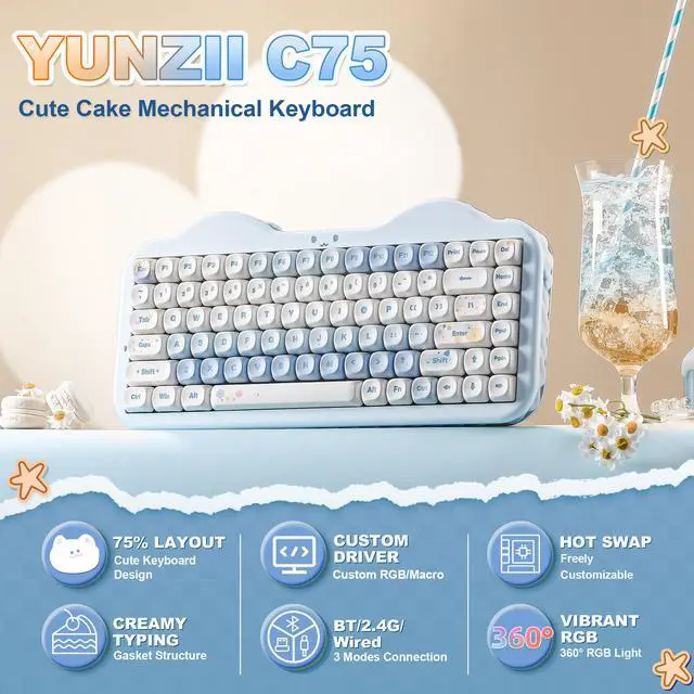 The new YUNZI C75 cute mechanical keyboard series is a sweet addition to desk accessories with a colorful keyboard design. Boasting all the beloved featureshigh-quality mechanical keyboard, compact 75% layout Keyboard, wireless, BT, and wired connectivity, and creamy typing sound. This cute wireless gaming keyboard shines as a gift or a charming setup for the home, office, workspaces, and gaming stations.