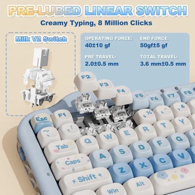 This cute mechanical gaming keyboard takes a gasket structure, and multiple layers of sound-absorbing fillings, pre-lubed mechanical switches, stabilizers, and solid silicone eliminate typing noise, creating a solid, creamy mechanical keyboard. Enjoy smooth and consistent keystrokes with a pleasantly Creamy sound of the thocky keyboard that enhances your typing comfort.