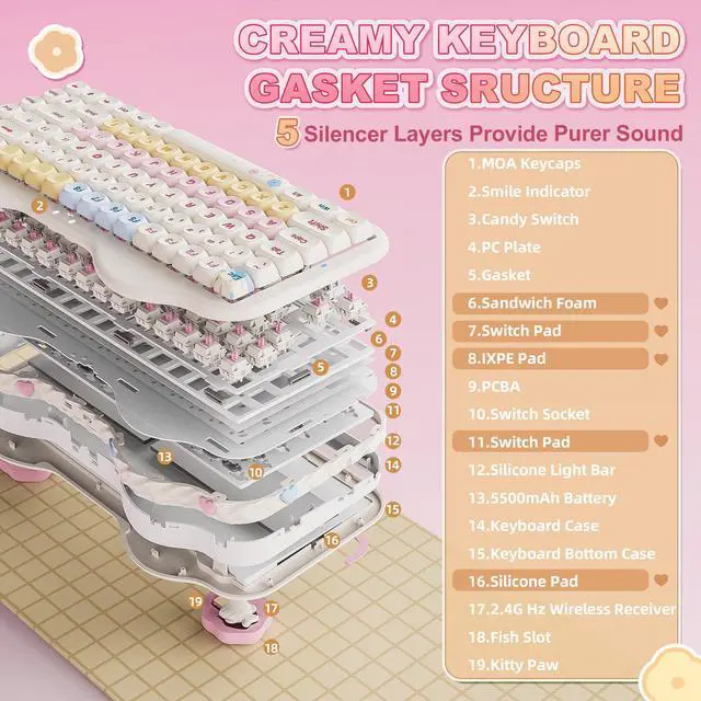 This cute mechanical gaming keyboard takes a gasket structure, and multiple layers of sound-absorbing fillings, pre-lubed mechanical switches, stabilizers, and solid silicone eliminate typing noise, creating a solid, creamy mechanical keyboard. Enjoy smooth and consistent keystrokes with a pleasantly Creamy sound of the thocky keyboard that enhances your typing comfort.