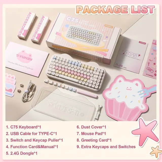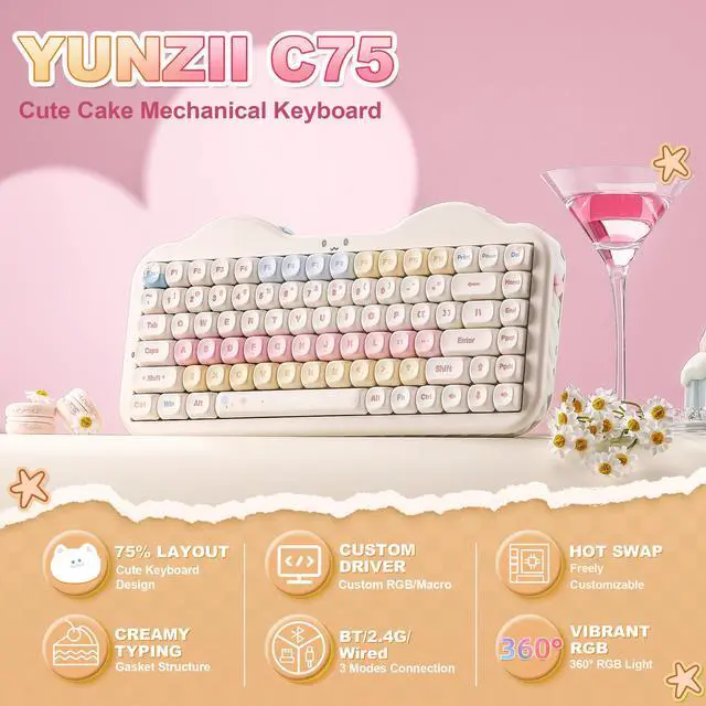 The new YUNZI C75 cute mechanical keyboard series is a sweet addition to desk accessories with a colorful keyboard design. Boasting all the beloved featureshigh-quality mechanical keyboard, compact 75% layout Keyboard, wireless, BT, and wired connectivity, and creamy typing sound. This cute wireless gaming keyboard shines as a gift or a charming setup for the home, office, workspaces, and gaming stations.