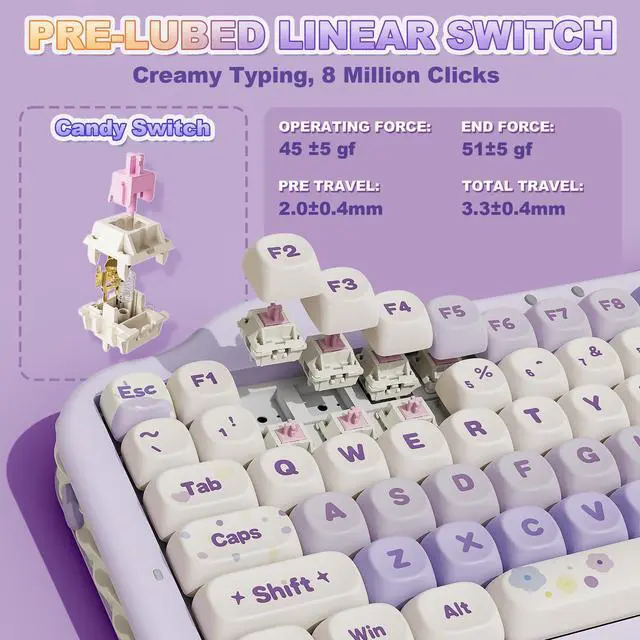 This cute mechanical gaming keyboard takes a gasket structure, and multiple layers of sound-absorbing fillings, pre-lubed mechanical switches, stabilizers, and solid silicone eliminate typing noise, creating a solid, creamy mechanical keyboard. Enjoy smooth and consistent keystrokes with a pleasantly Creamy sound of the thocky keyboard that enhances your typing comfort.