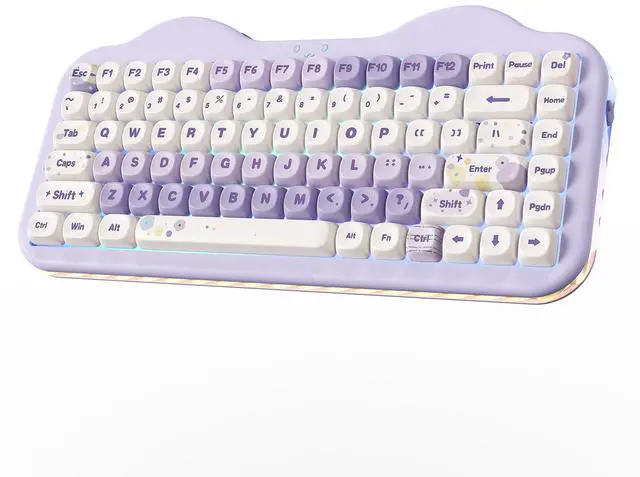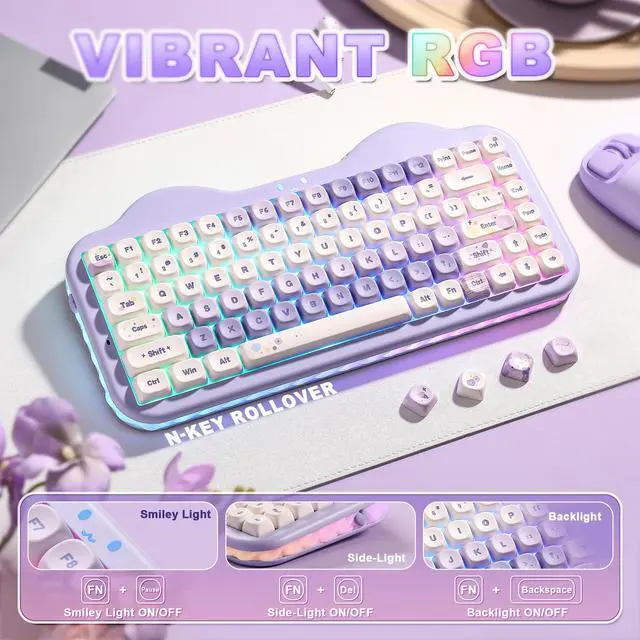 YUNZII C75 features stunning 3-zone RGB illumination that lets you customize the keys, cute cat face emblem, and side underglow separately. Cycle through endless preset effects with easy FN+ controls, turn on/off lights by Fn+Backspace or Fn+Enter to change color. More RGB shortcuts are listed in the manual and on the following page.