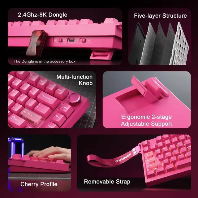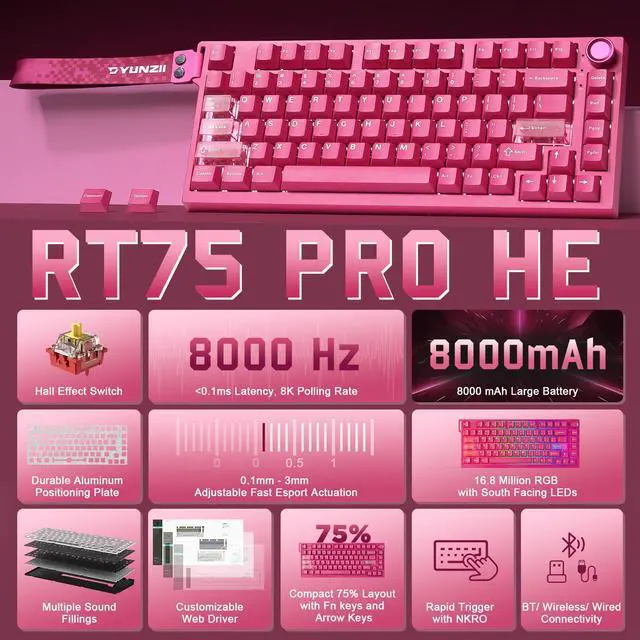 YUNZII RT75PRO mechanical keyboard delivers an 8K polling rate in both wired and 2.4G modes for gaming keyboard-level responsiveness (0.1ms wired/1ms wireless). This advanced magnetic keyboard features triple-mode connectivity (USB-C/2.4G/Bluetooth), delivering a premium wireless gaming keyboard experience with cutting-edge Hall Effect precision.