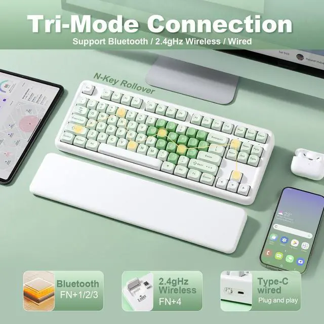 With tri-mode connection technology, including Bluetooth, 2.4G wireless, and USB wired, this wireless keyboard can connect up to 5 devices simultaneously and is compatible with Windows, Mac, Linux, iOS, and Android. Which means the user can seamlessly switch between devices to increase productivity. It comes with a built-in 4000 mAh battery, allowing for extended use without frequent charging, making it great for both home and office.