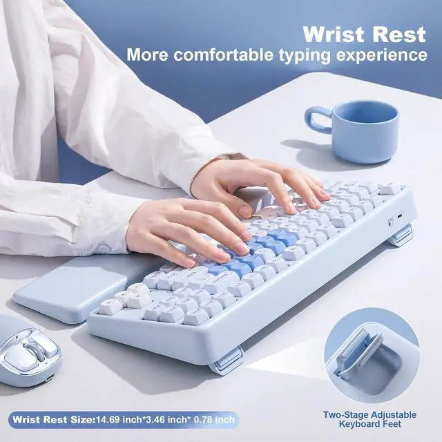YUNZII B87 wireless mechanical keyboard utilizes an 80% layout, providing a space-saving solution for your desk while maintaining full functionality. The unique bear-patterned Dye Sublimation PBT keycaps add a touch of personality to your typing experience. The keyboard frame is made from premium ABS material and comes with a complimentary soft-touch wrist rest, ensuring durability while offering a skin-friendly feel for comfortable use.