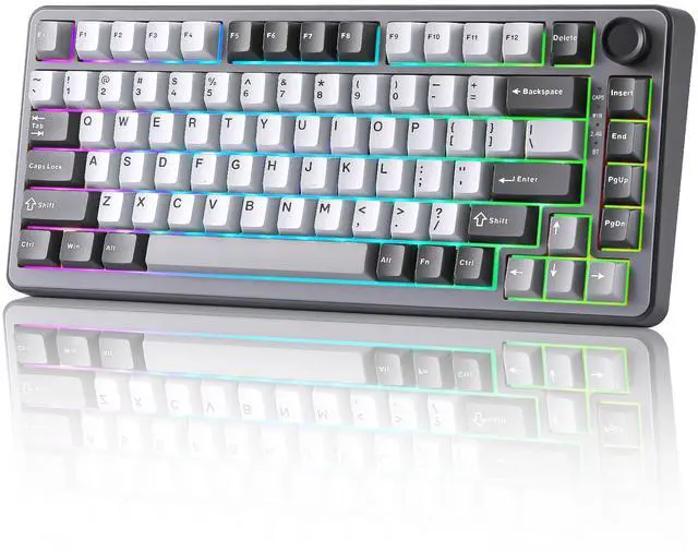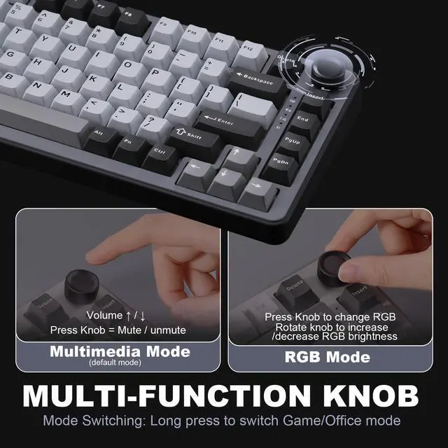 The B75 PRO is a compact keyboard with a knob and 82 keycaps. The TKL keyboard has number keys, function keys, and arrow keys at the same time. The multi-function knob of the 75% compact mechanical keyboard enables you to adjust the sound level and backlit fast. Long-press the multifunctional knob of this RGB keyboard to switch between gaming and office modes, and rotate the knob to adjust the keyboard volume and RGB backlit effects.