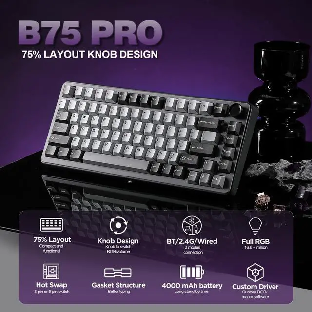 The B75 PRO wireless gaming keyboard supports Bluetooth, 2.4GHz wireless, and a stable Wired connection. Built-in 4000mAh high-capacity battery, this mechanical keyboard delivers extended usage times in a wireless setup. This large battery capacity ensures that the wireless Bluetooth gaming keyboard is always ready for long work or intense gaming mode.
