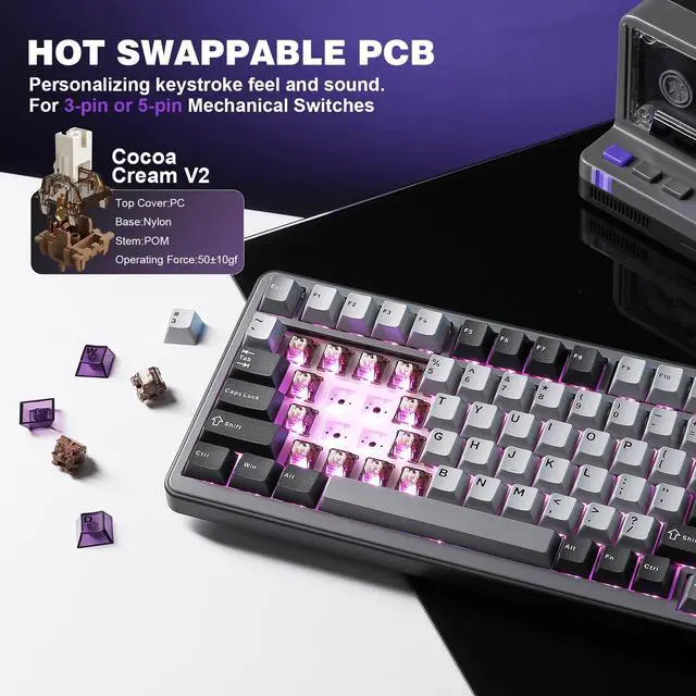 Hot swappable mechanical keyboard takes full-key hot-swappable sockets and ultra-responsive, low-latency. The premium PCB board of the custom keyboard is compatible with 3-pin/5-pin switches, to meet your desired typing feel, whether it's for gaming, typing, or creative endeavors. Pre-lubed linear and tactile switches have a unique design, solid sound, and excellent keystroke feel.