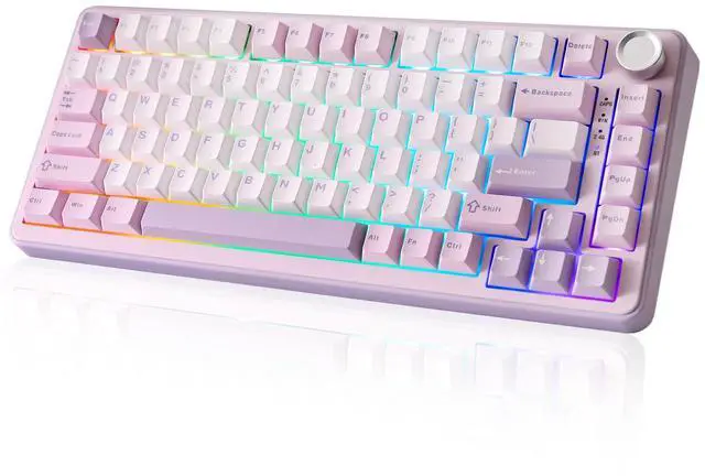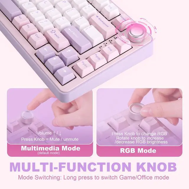 The B75 PRO is a compact keyboard with a knob and 82 keycaps. The TKL keyboard has number keys, function keys, and arrow keys at the same time. The multi-function knob of the 75% compact mechanical keyboard enables you to adjust the sound level and backlit fast. Long-press the multifunctional knob of this RGB keyboard to switch between gaming and office modes, and rotate the knob to adjust the keyboard volume and RGB backlit effects.