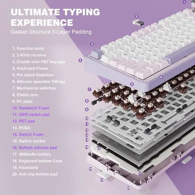 The B75 PRO keyboard is designed with the most advanced gasket keyboard structure. With 5-layer padding, noise cancellation design, double-shot keycaps, precision-tuned stabilizers, and pre-lubricated mechanical switches, this linear keyboard provides a virtually creamy sound keyboard typing experience and a solid typing feel.